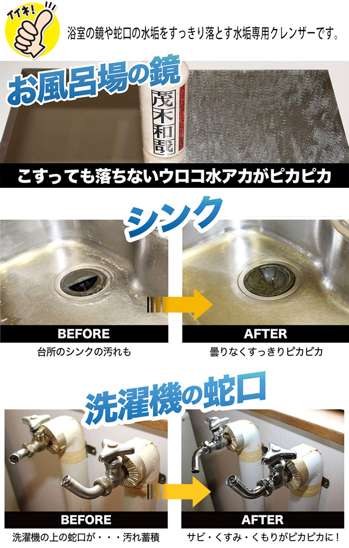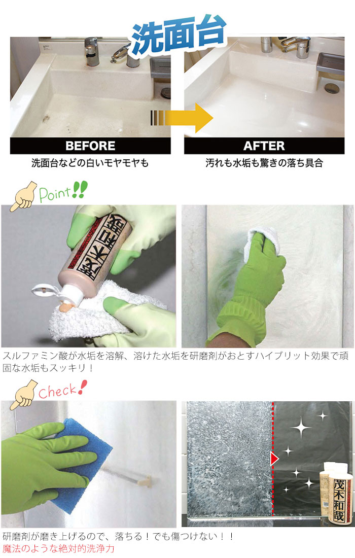 ●スルファミン酸が水垢を溶解、溶けた水垢を研磨剤がおとすハイブリット効果で頑固な水垢もスッキリ!●水垢だけでなく、鍋、フライパンのコゲや工具のサビ、便器の黄ばみの除等幅広くお使いいただけます。