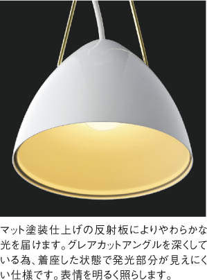 ◆LED一体型 ◆明るさ:白熱球60W相当 ◆埋込穴 : φ75 ◆総W数:LED6.2W ◆部位・材質・色・仕上げ セード:鋼・白色塗装ツヤ仕上 飾り:鋼・しんちゅう色メッキヘアライン ◆サイズ:高-250 幅-φ115 全長-1300〜400 埋込穴径-φ75mm 重-0.7kg ◆消費電力:6.2W ◆色温度:2700K ◆演色性:Ra85 ◆光源寿命:40,000時間 ◆高さ調節可能型 ◆埋込時:埋込必要高77mm ◆埋込時:断熱施工(ブローイング、マット敷工法)・高気密対応型 ◆コード・キャブタイヤコード φ3.8 ◆調光器との併用はできません ※色温度:2700K ※白熱球60W相当Y-pendant 光沢感のある骨白色のセードが柔らかい光を灯し、 ダイニングの表情を照らします。